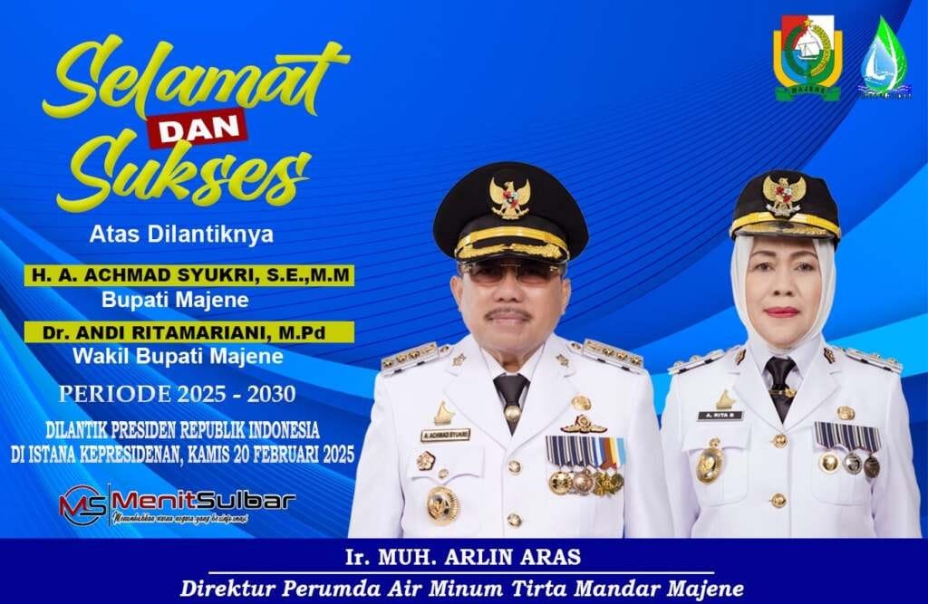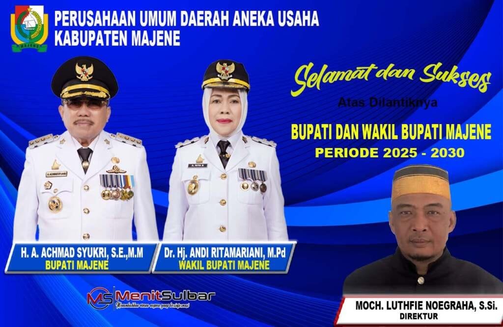 Ucapan Selamat atas dilantiknya Bupati dan Wakil Bupati Majene Periode 2025-2030 dari Bank BRI Cab. Majene, Perumda Air Minum Tirta Mandar Majene, dan Perusda Aneka Usaha Majene